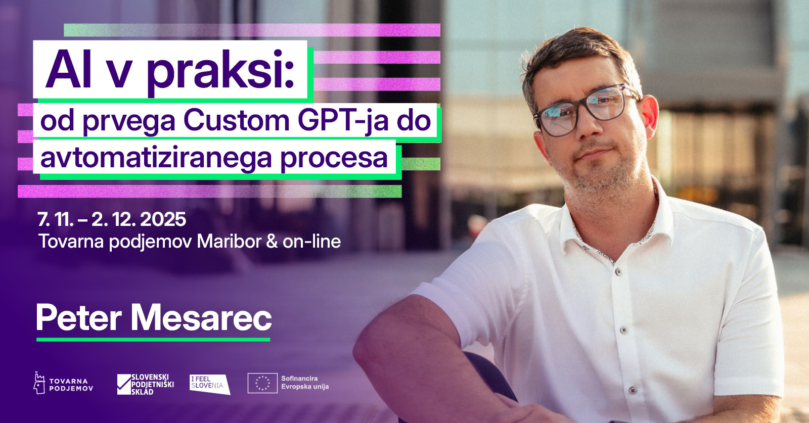 Peter Mesarec je marketingar z 20+ leti izkušenj, specializiran za digitalni marketing in optimizacijo poslovnih procesov. Umetno inteligenco uvaja praktično (ne le izobraževalno) in ChatGPT uporablja vsak dan od novembra 2022. Sodeloval je z 150+ podjetji in javnimi institucijami (npr. Bank for International Settlements, Grossbasket, Špica, Perutnina Ptuj) ter izvedel 500+ delavnic in predavanj (tudi na ADMA). Na svojih programih združuje znanje in konkretne rešitve, da podjetja z AI pridobijo prednost že danes.