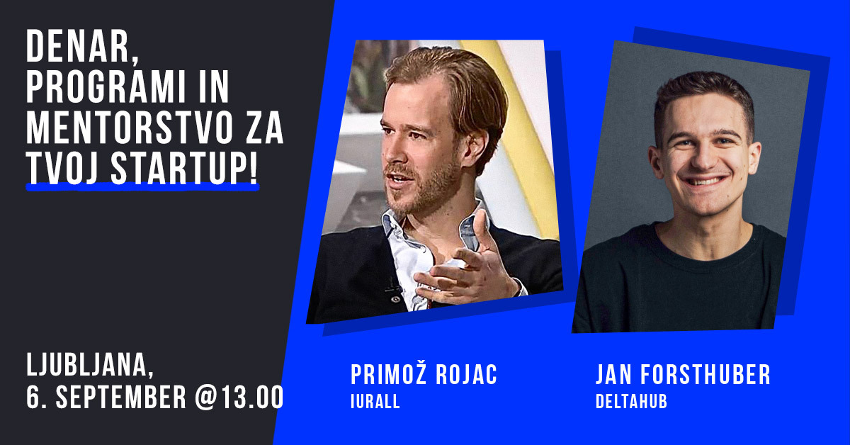 Na dogodku boste spoznali kako do 75.000 EUR konvertibilnega posojila oz. do 600.000 EUR lastniške investicije, ki jih inovativnim podjetjem omogočata razpisa SK75 in SI-SK Slovenskega podjetniškega sklada. Izkušena startup podjetnika Primož Rojac in Jan Forsthuber bosta z vami delila neprecenljive nasvete za izgradnjo startup podjetja.